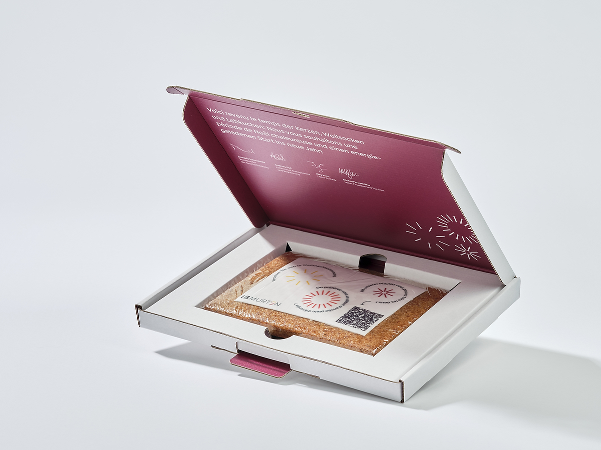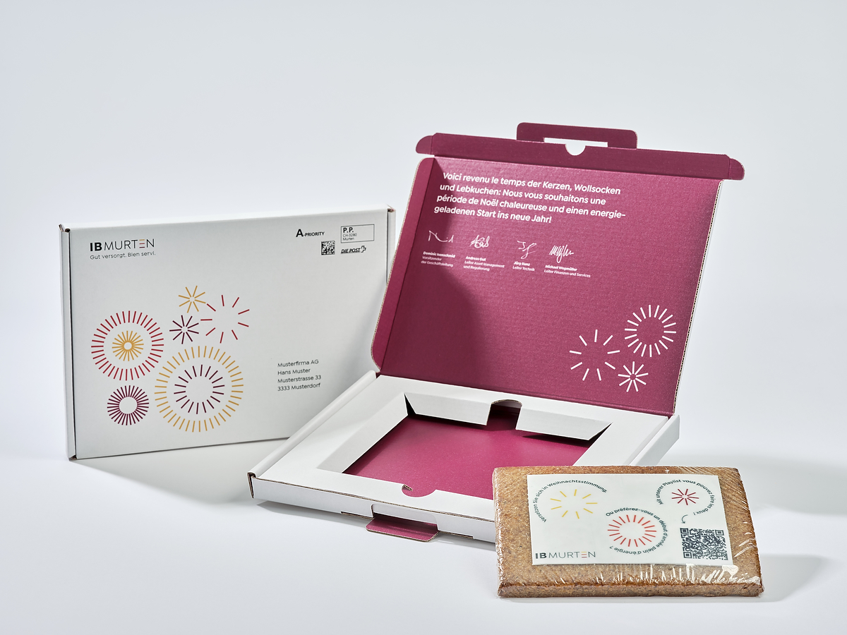 In der Weihnachtszeit einen Lebkuchen zu versenden, welcher unbeschadet beim Empfänger ankommt. Dies war die Ausgangslage welche wir gemeinsam mit der Grafik Agentur angegangen sind. Daraus resultierte ein Versandumschlag aus Wellkarton inklusive passendem Innenleben, um den Lebkuchen zu versenden. Da der Kunde eine saubere Excel Adressdatenbank angeliefert hat, konnte bereits jeder Versandumschlag adressiert und personalisiert werden, was ein nachträgliches und mühsames Adressieren per Etikette erübrigte. Zudem hat uns die Erfahrung aus diversen Mailings dabei geholfen, den Versand über den kostengünstigeren Brieftarif der Post abzuwickeln anstatt zum Paketposttarif.